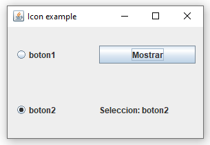 Tenemos un ButtonGroup con dos JRadioButton, despues tenemos un JButton y un JLabel, el objetivo es que el label muestre cual de los dos botones está seleccionado pero SOLO al pulsar en el boton "Mostrar", al seleccionar cualquiera de los dos botones no se debe de lanzar ninguna accion.
