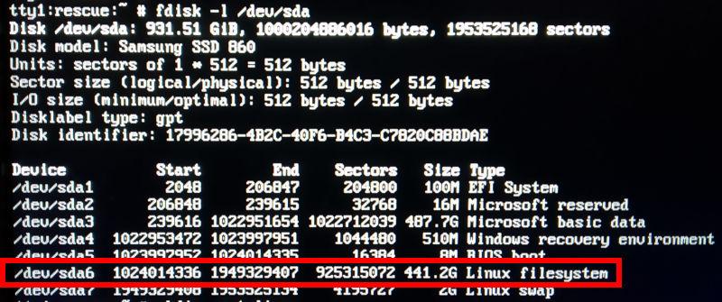 Primero tenemos que montar el sistema donde estaba instalado GRUB, para saber cual es la particion exacta podemos usar fdisk: